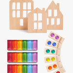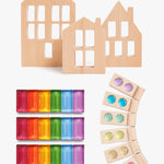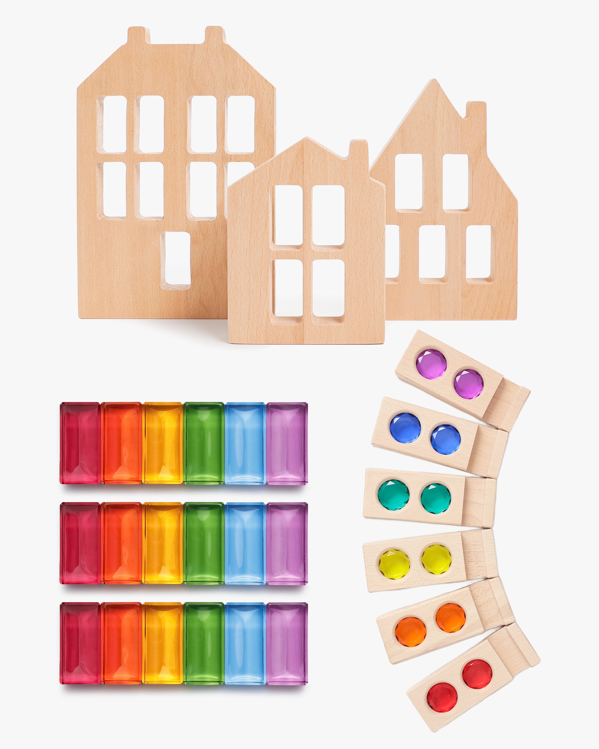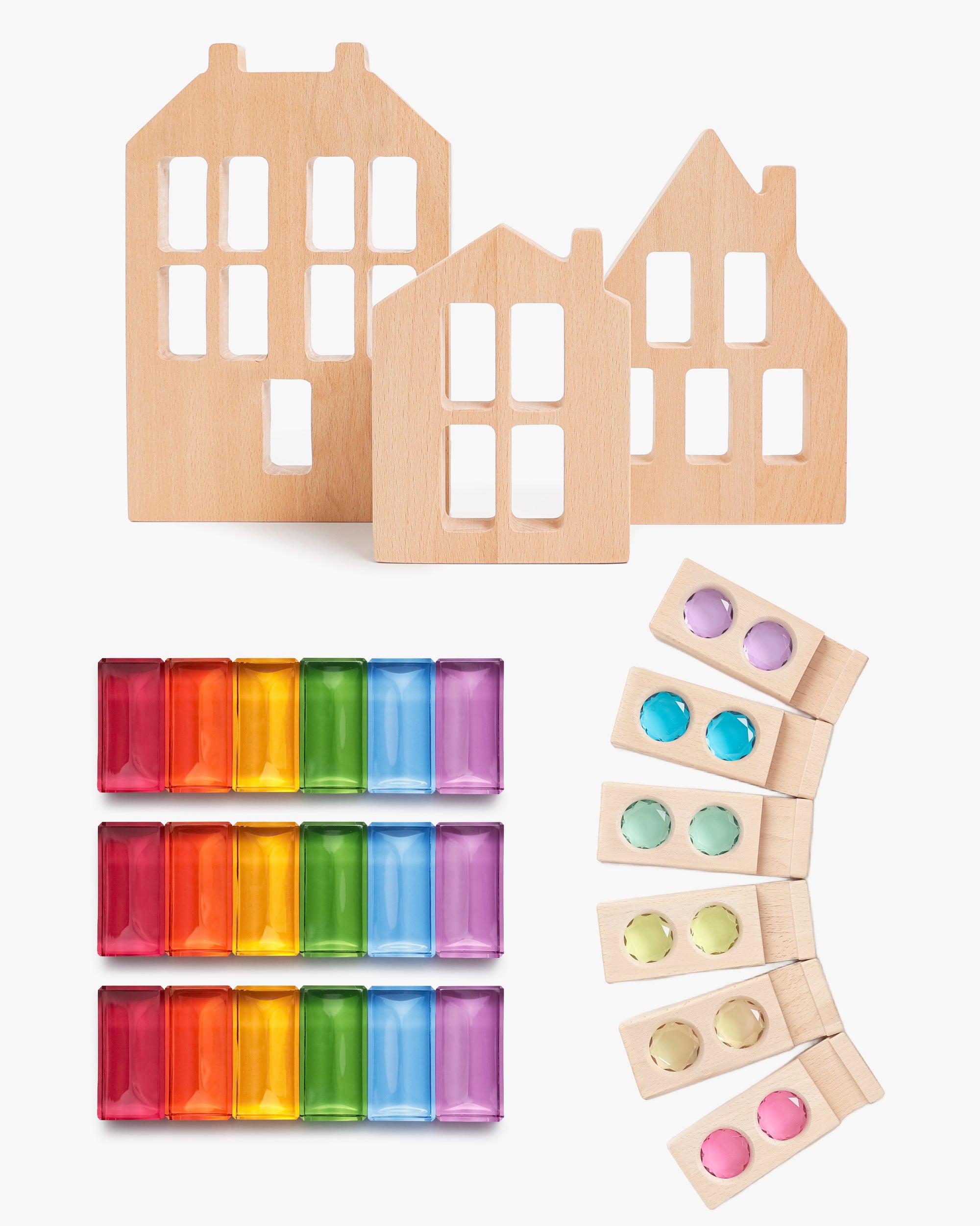 Buy the whole collection and get your neighborhood set up from the beginning! The complete 3 house collection includes one small, one medium and one large house, 6 stand blocks, and 18 Forest Rainbow Block windows. You’ll have everything you need to create whimsical and colorful builds with your kids.