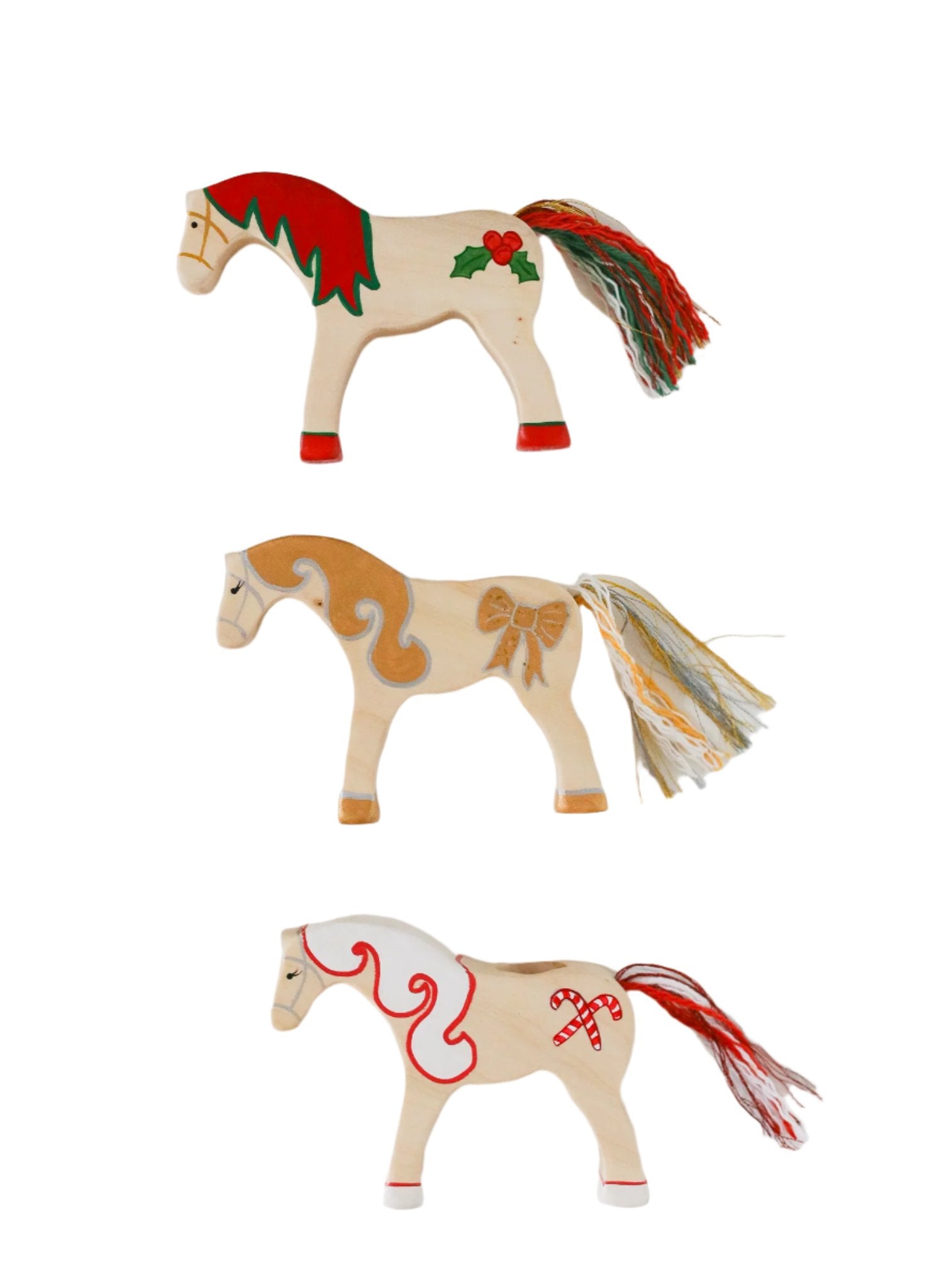 Celebrate the season with a handcrafted holiday peg doll horses from Hello Sugarhouse! Designed with care and made from premium Maple hardwood or solid Walnut, each horse is hand-sanded and hand-painted with love. We seal them with a non-toxic finish, ensuring they are safe for little hands and built to last for generations. Complete with a soft yarn tail, these charming horses are the perfect fit for one peg doll, making them a delightful addition to any holiday playtime.