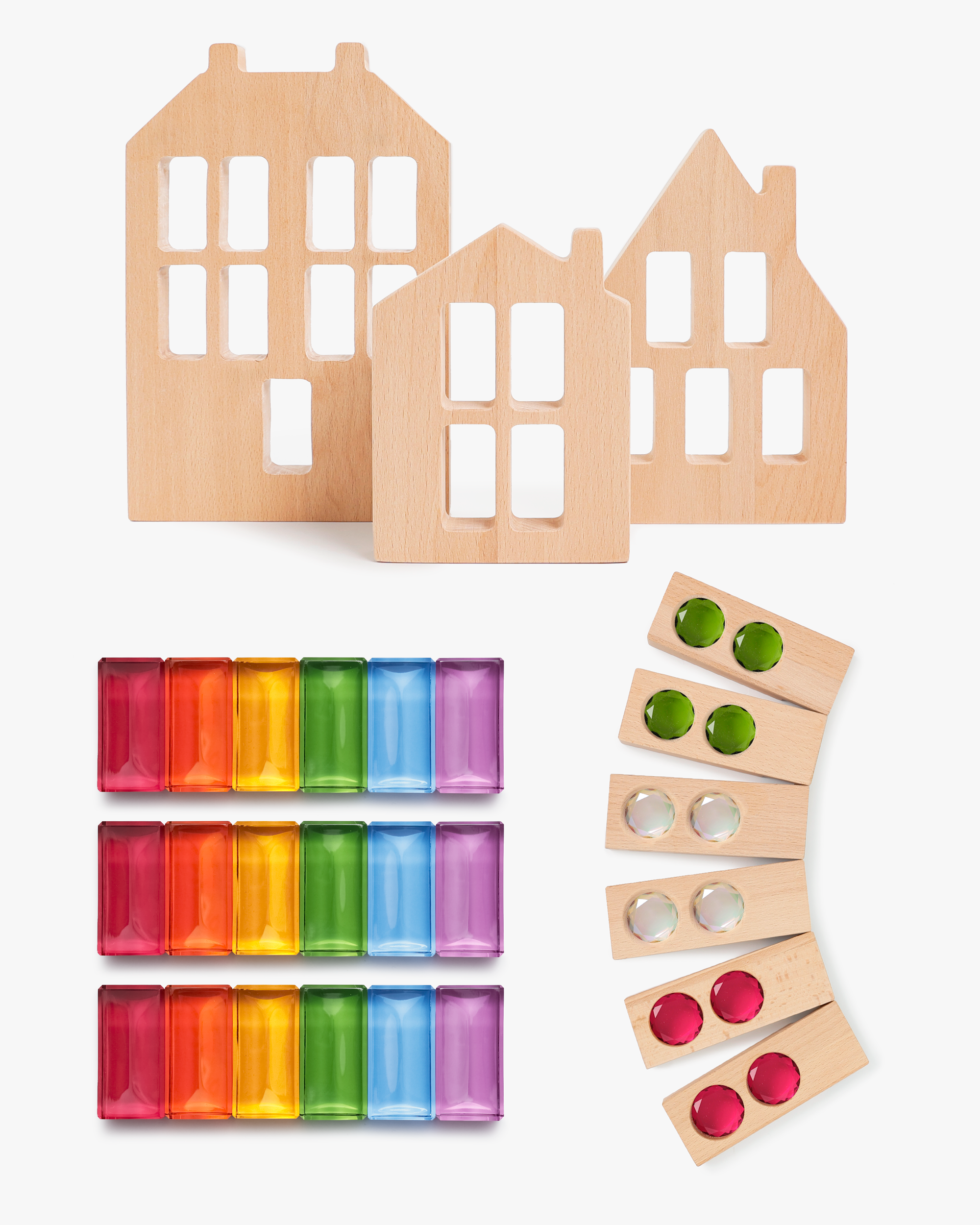 Buy the whole collection and get your neighborhood set up from the beginning! The complete 3 house collection includes one small, one medium and one large house, 6 stand blocks, and 3 Forest Rainbow Block packs. You’ll have everything you need to create whimsical and colorful builds with your kids.