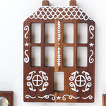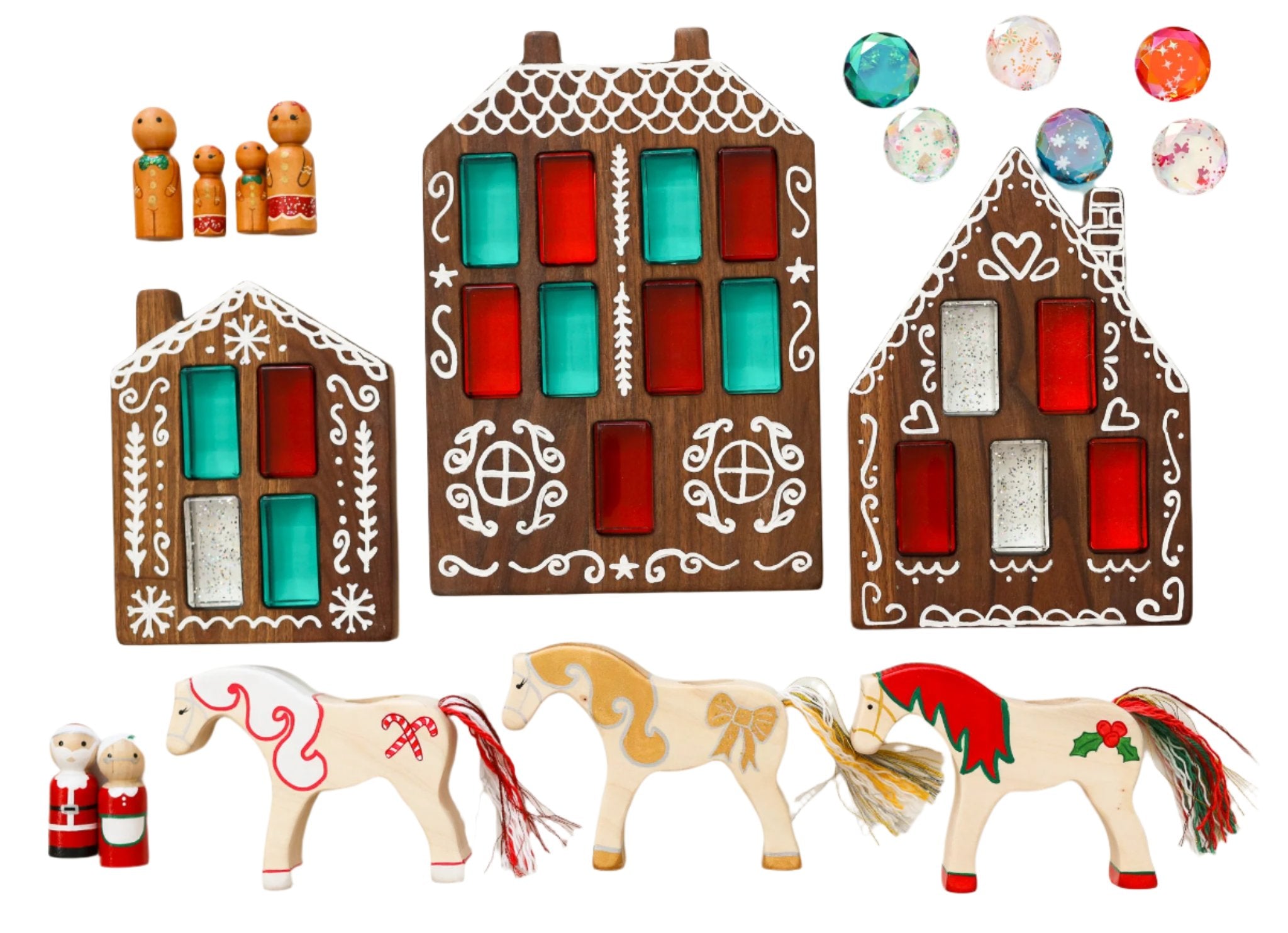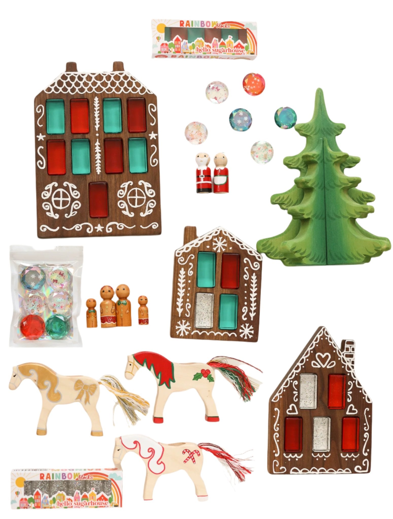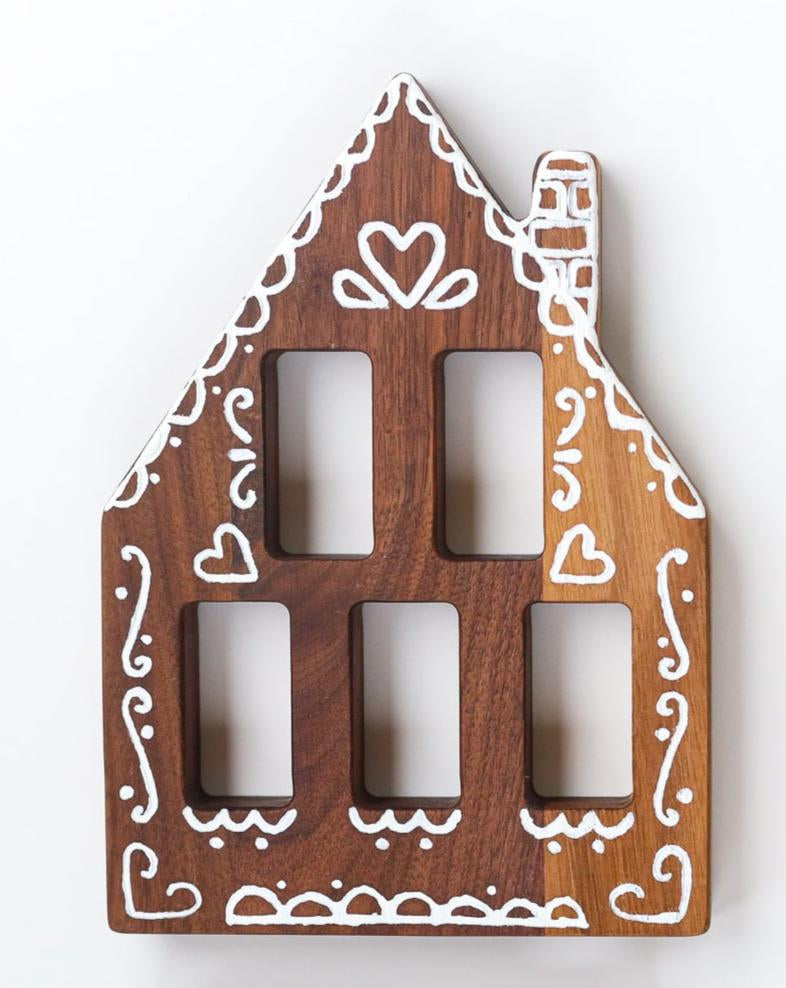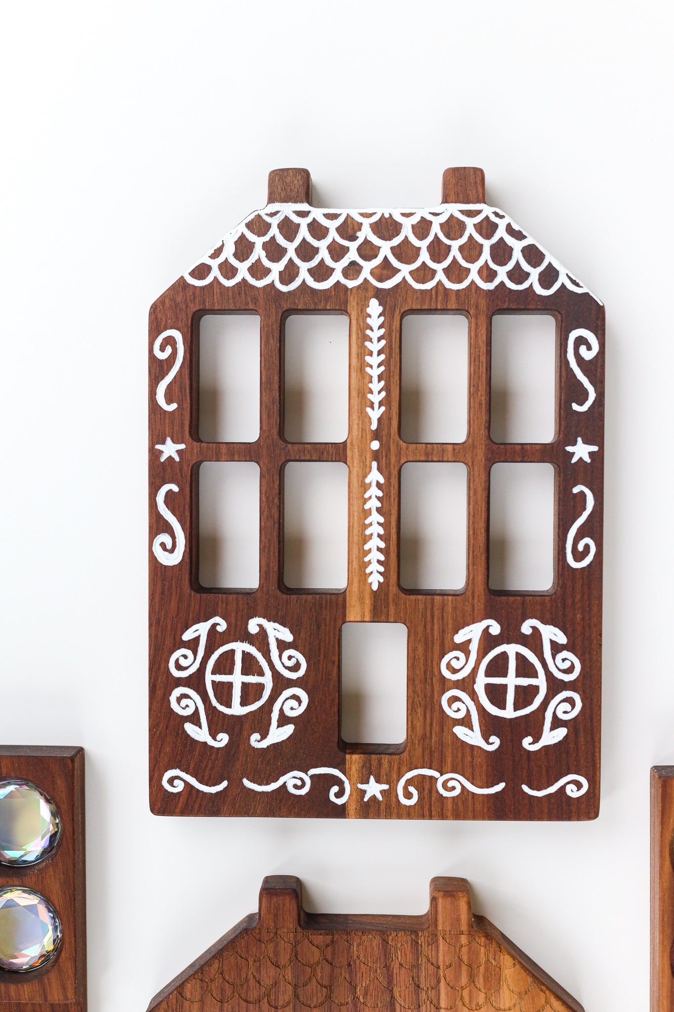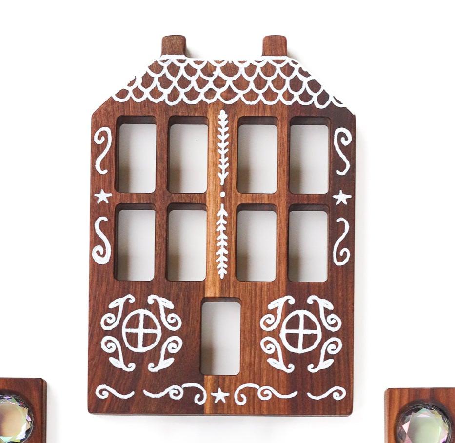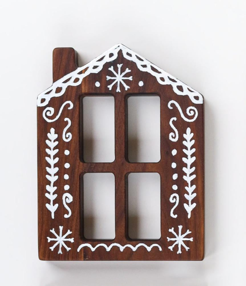 These BEAUTIFUL gingerbread houses are cooking up at our Hello Sugarhouse bakery! They are made from premium Walnut, oiled with non-toxic osmo oil, and painted with white acrylic paint "frosting". Designed by us and manufactured in Michigan by talented woodworkers and artists. These will be treasured pieces for years and years to come.