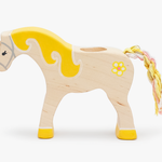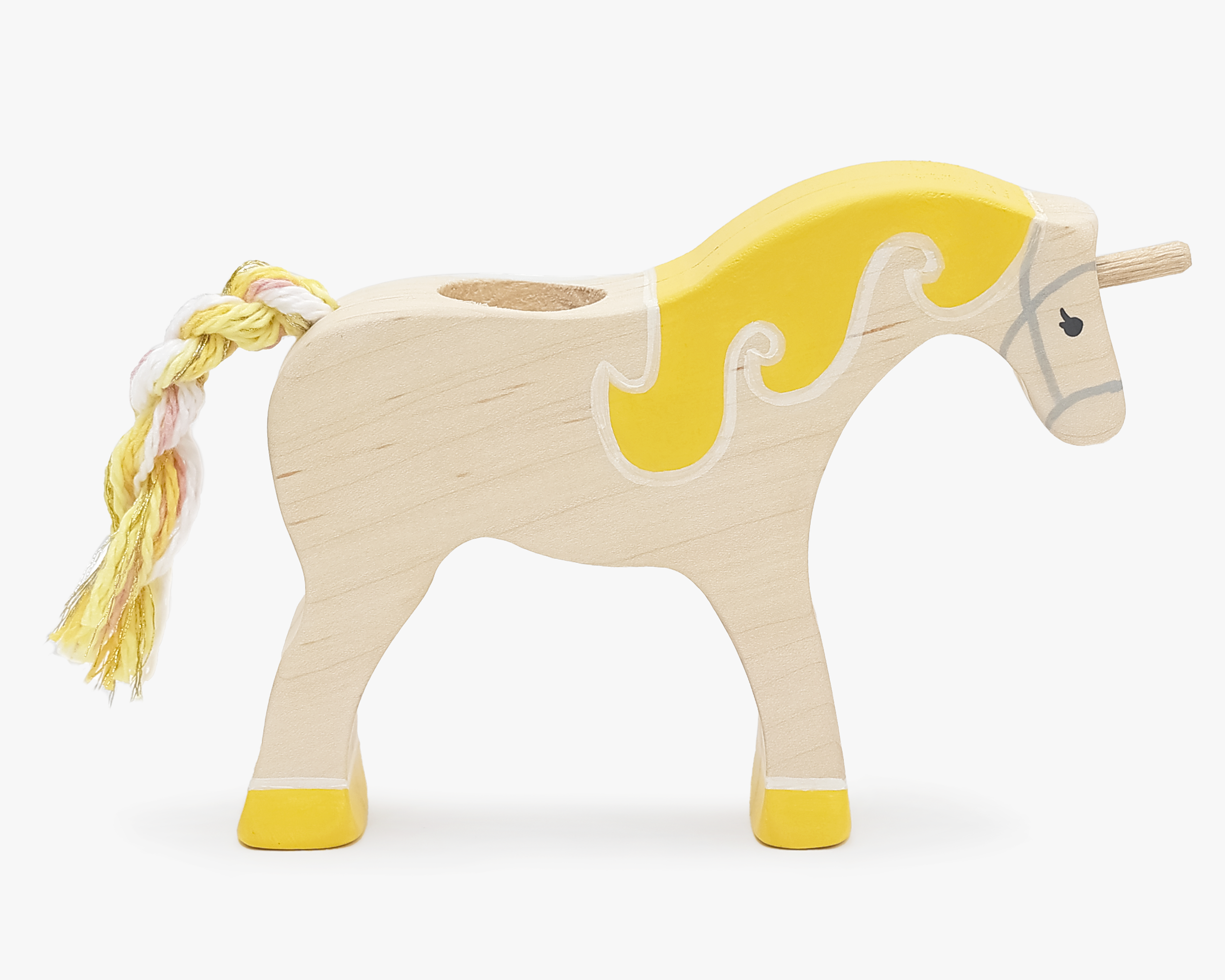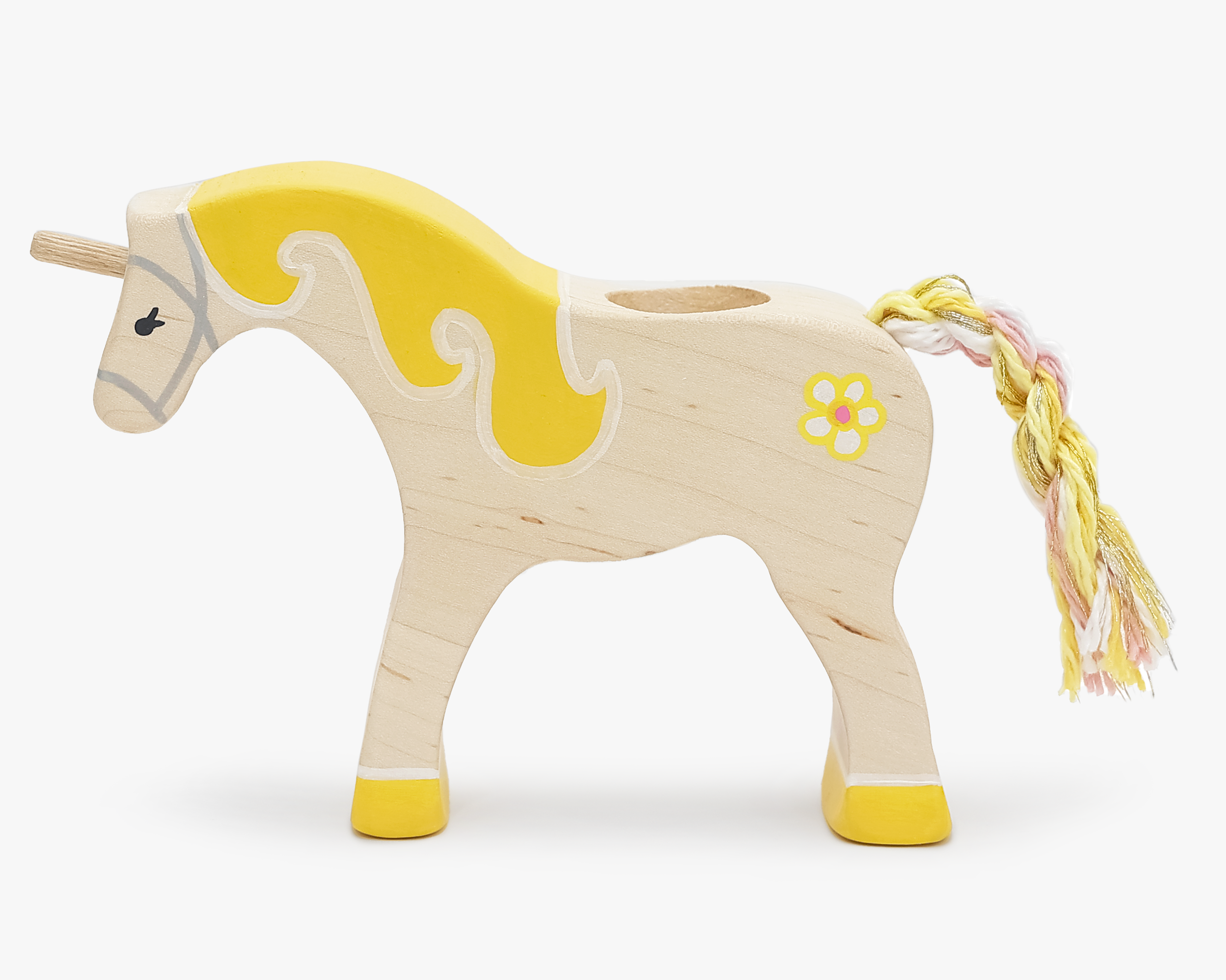 Bring a little sunshine to playtime with our Daisy Unicorn. This cheerful wooden unicorn features bright yellow accents, a sweet hand-painted daisy, and a soft braided tail that adds texture and charm to imaginative adventures. The open saddle design makes it easy for peg dolls to ride along as children create magical stories and whimsical worlds.